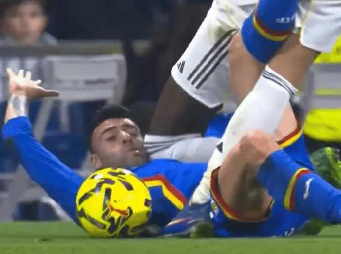 #皇马0比1赫塔费# 当地时间周一晚,在西甲第26轮皇马vs赫塔菲的比赛中,第25分钟出现争议一幕。赫塔菲后卫迭戈-里科在与居莱尔拼抢后倒在边线附近,随后吕迪格在跑动中从其身旁经过,左膝击中里科的下颌和肩部。慢镜头回放显示,这次碰撞画面颇为惊险。不过主裁判穆尼斯-鲁伊斯当时未判罚犯规,VAR也没有介入改判。